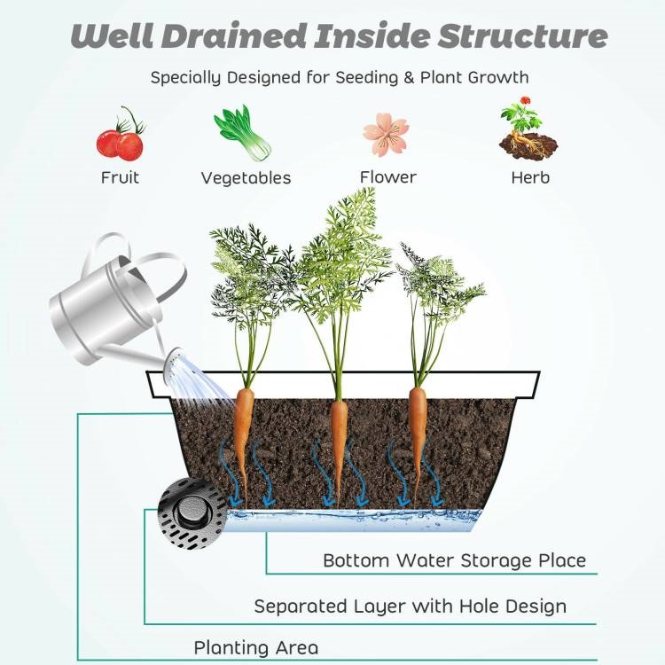This 3 Tier Black Plastic Vertical Garden Planter Set ensures each tier gets sufficient sunlight, hydrating plants without bending over the waist. Each 20" (L) x 6.5" (W) x 5" (H) flower container box has an internal panel with holes, which will filter excess water to store at the bottom of the plant pot. This specially designed double-layered inside structure will effectively prevent root rot. No need on worrying about overwatering. Made of premium PP, the flower pot has an excellent performance in durability, suitable for indoor and outdoor use. Tightly connected parts ensure firmness, stably keeping the pot set in an upright position. Since its lightweight feature, you can effortlessly move the planter to different places as needed. It is ultra-easy to assemble the flower pot stand in a few minutes by reading the instruction carefully.